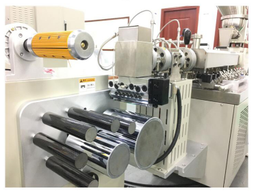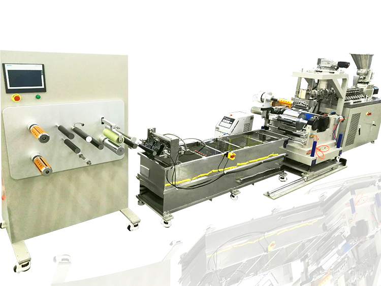 The laboratory PVDF Hollow Fiber Ultrafiltration Membrane line consists of 3 parts, part 1 is twin screw extruder unit, the second part is casting and water cooling, the third part is the film winder.