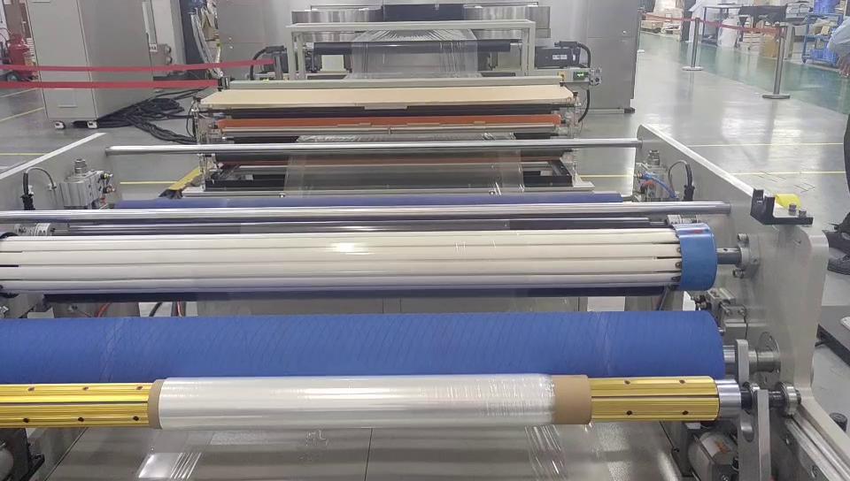 (2)拉伸装置主要由链铗、链条导轨、机架、链条张紧装置、入口纠偏装置、传动装置、开铗装置、闭铗装置、丝杆调幅装置、滑块、保温地台等组成。链条上装有铗具,铗具夹住片材两边缘,在可变幅宽导轨上进行对薄膜的横向拉伸,拉伸倍率可以根据工艺要求调节。入口回转链轮安装在两套高精度的重型直线导轨上,两台电动推杆与链轮底座相连接,电动推杆对入口薄膜的位置作自动调节,保证薄膜能准确进入拉伸装置。