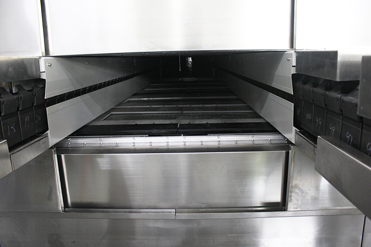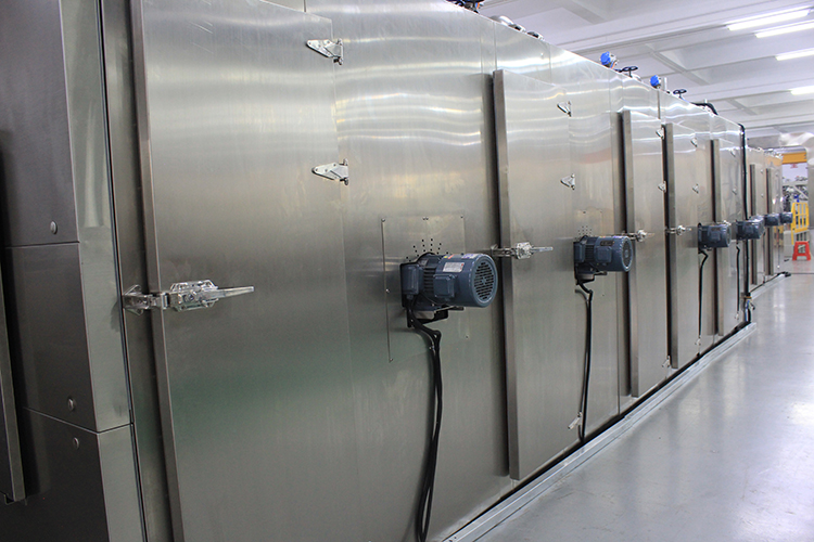 (1)烘箱采用热风循环的加热形式,能提高热能的利用效率,同时减少功耗。烘箱内部的风道采用两两对称的结构,上、下烘箱也是对称分布,这样烘箱内部热量分布均匀,保证薄膜受热均匀,